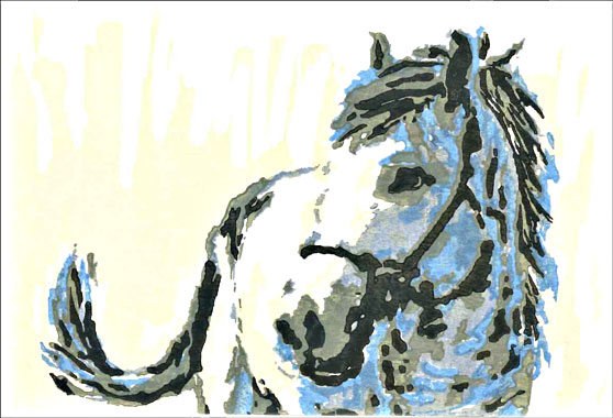 | 弊社の年賀状 馬の躍動感と力強さを表現するために、逆光の影の部分の筋肉を際立つように描写しております。 |